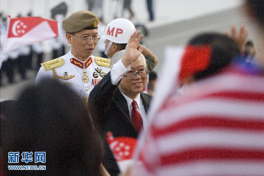 當地時間2012年8月9日,新加坡迎來國慶47周年。圖為新加坡總統陳慶炎(前中)出席在新加坡濱海灣浮動舞臺舉行的國慶慶典。圖片來源:新華網
