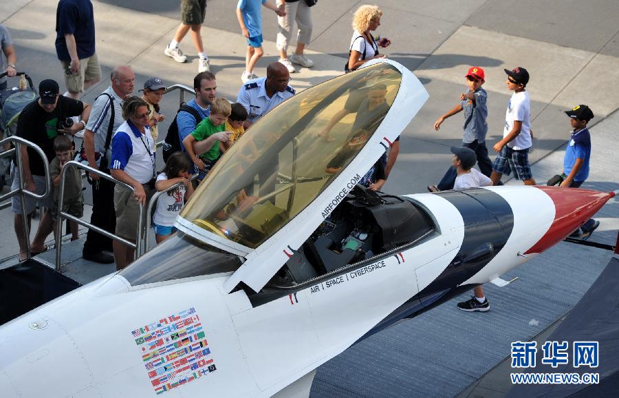 8月20日,參觀者在美國紐約“無畏”號航母博物館與軍用戰機近距離接觸。紐約空軍周于8月19日在這里開幕,8月21日結束。在空軍周期間,人們可以觀看軍用飛機表演、參觀軍用電子設備展,了解軍用醫療后勤保障,并進行互動。 新華社記者王雷攝