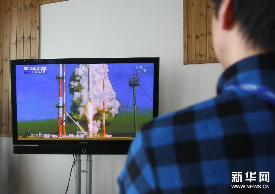 1月30日,在韓國平昌冬季特奧新聞中心,工作人員在觀看“羅老”號運載火箭發射的現場直播。 北京時間1月30日15時,韓國與俄羅斯合作研制的“羅老”號運載火箭從位于韓國西南部的航天中心點火升空。 新華社記者姚琪琳攝