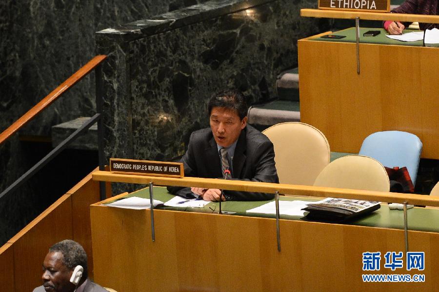4月2日,第67屆聯合國大會在紐約聯合國總部舉行會議,就《武器貿易條約》草案進行投票表決。這是朝鮮代表團成員發言。第67屆聯合國大會當日以154票贊成、3票反對和23票棄權通過《武器貿易條約》草案。敘利亞、朝鮮和伊朗投了反對票。 新華社記者牛曉雷攝