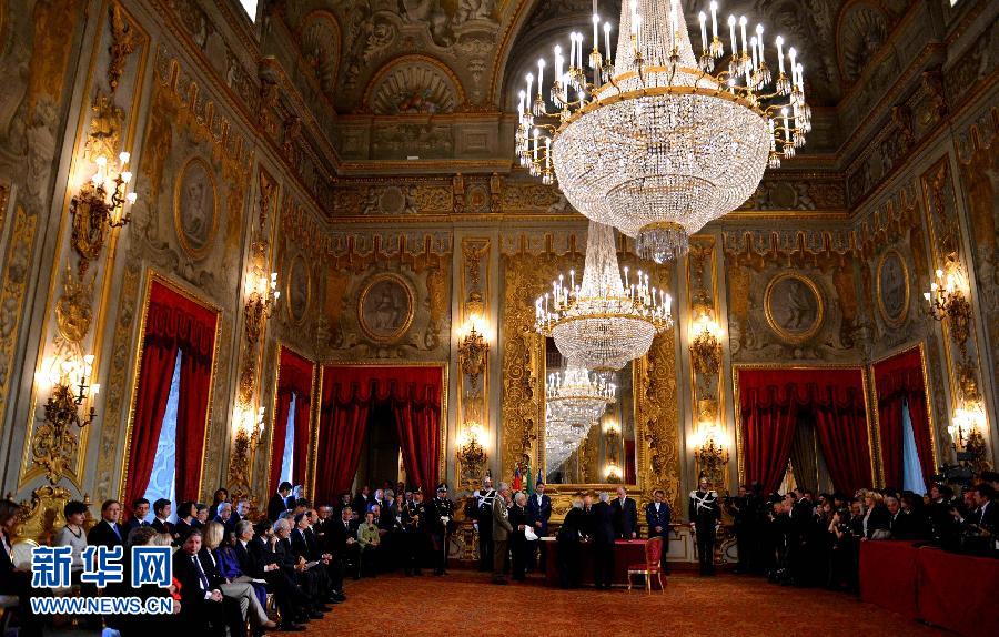 4月28日,在意大利羅馬總統府,新一屆內閣成員宣誓就職。當日,意大利新總理恩里科·萊塔攜新一屆內閣成員在總統府宣誓就職。 新華社記者許逆之攝