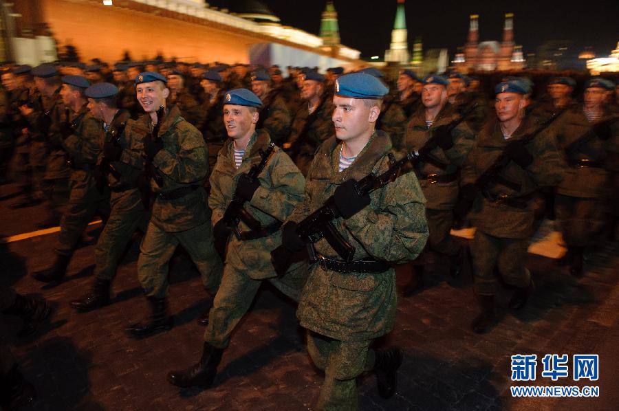 5月3日,俄羅斯官兵在莫斯科紅場進行勝利日閱兵式夜間彩排。 5月9日是俄羅斯衛國戰爭勝利日,首都莫斯科紅場閱兵儀式是當天的主要慶祝活動。今年將有11000多名俄官兵及軍校學生參加閱兵式,并將展示101種現代武裝裝備。新華社記者姜克紅攝