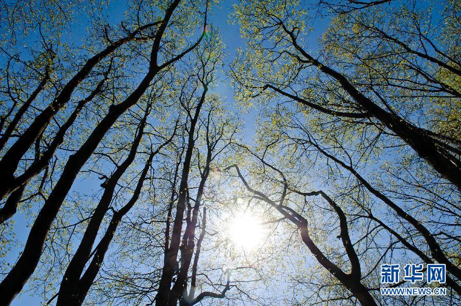 5月7日,俄羅斯莫斯科公園內的樹枝掛上新綠。