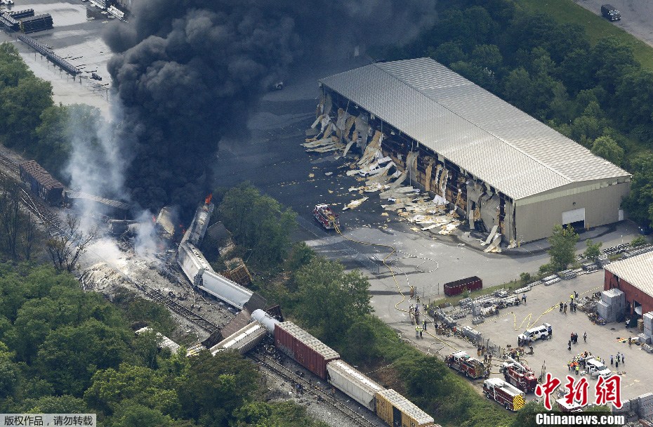 美一貨運列車脫軌發生爆炸 震塌廠房