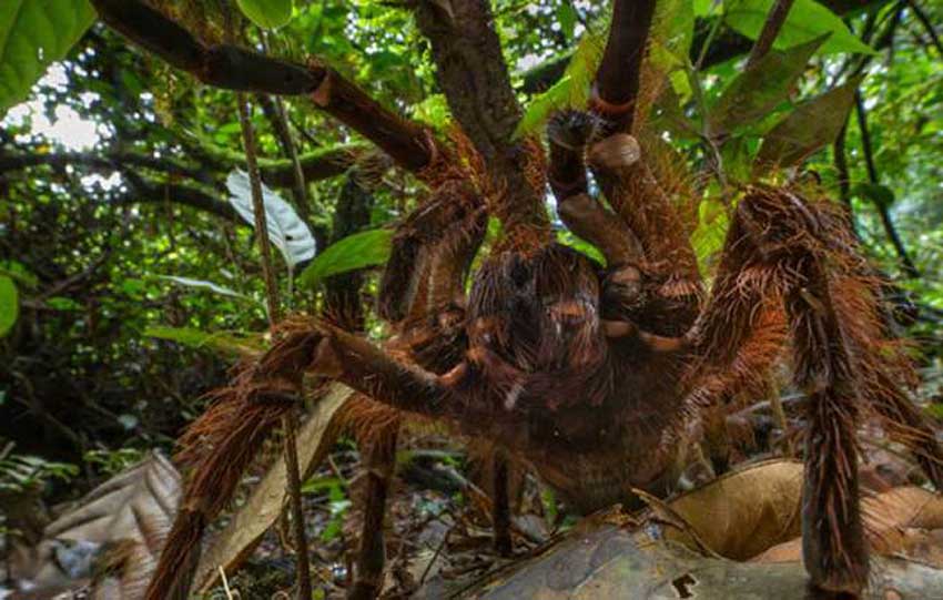 據外媒報道,美國一研究學者近日在拉丁美洲國家圭亞那叢林偶遇世界最大體積蜘蛛——亞馬遜食鳥蛛,由于發現時為夜晚,科學家還把蜘蛛誤認成了小型哺乳動物。 據報道,這種亞馬遜食鳥蛛是吉尼斯世界紀錄上體積最大的蜘蛛,它的腿伸開后最長能達到30厘米,重量能達170克,大約為一只年幼小狗的重量。