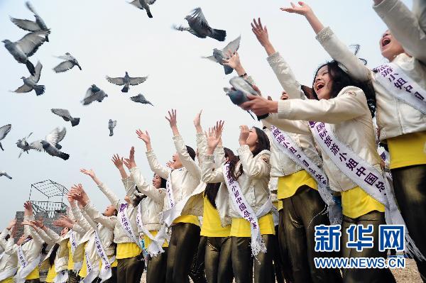 4月21日,參賽選手在放飛和平鴿。當日,2011國際旅游小姐中國總決賽選手在遼寧大連旅順口進行文化巡游活動。選手們登上旅順老鐵山體驗歷史文化,在和平公園放飛和平鴿祈求和平,并身穿比基尼泳裝進行宣傳展示。新華社發(姜冰 攝)