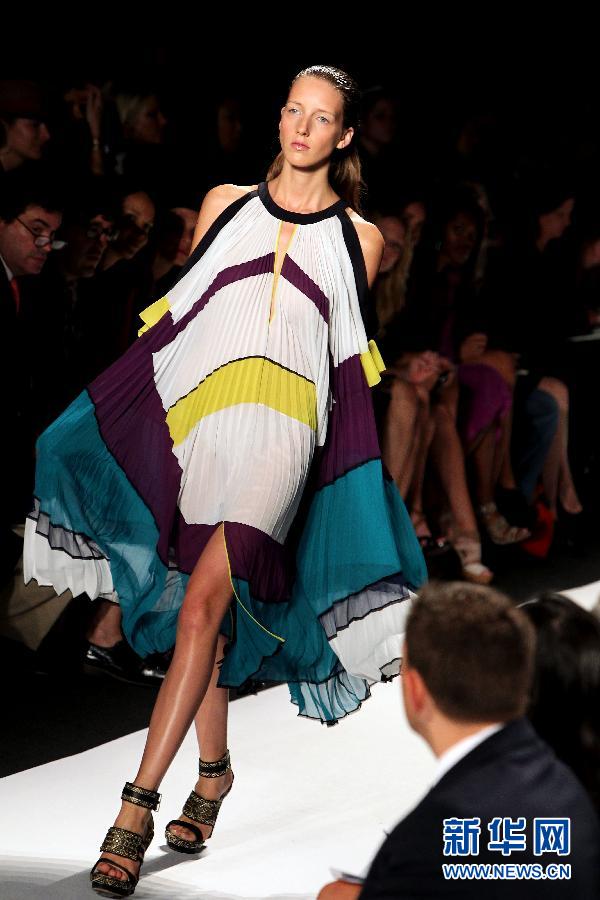 9月8日,在美國紐約舉行的梅賽德斯-奔馳紐約2012春夏時裝周上,一名模特展示BCBGMAXAZRIA品牌的服裝。梅賽德斯-奔馳紐約2012春夏時裝周當(dāng)天開幕。本屆時裝周為期8天,將展示近百個品牌的2012春夏系列時裝。 新華社記者伍婧丹攝