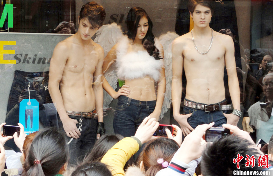 3月11日,江蘇蘇州市觀前街一家服裝店請來幾名外國模特,半裸進行商品廣告促銷活動,吸引了眾多顧客的目光。中新社發 王建康 攝