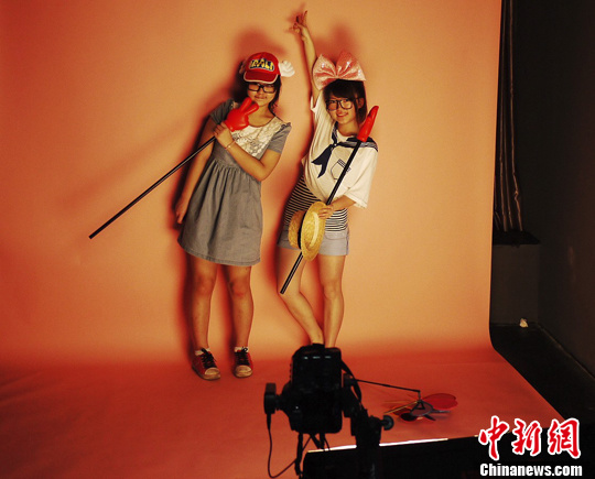 5月11日,兩位即將參加高考的高三學生,來到湖南一家攝影中心自拍解壓。中新社發 楊華峰 攝