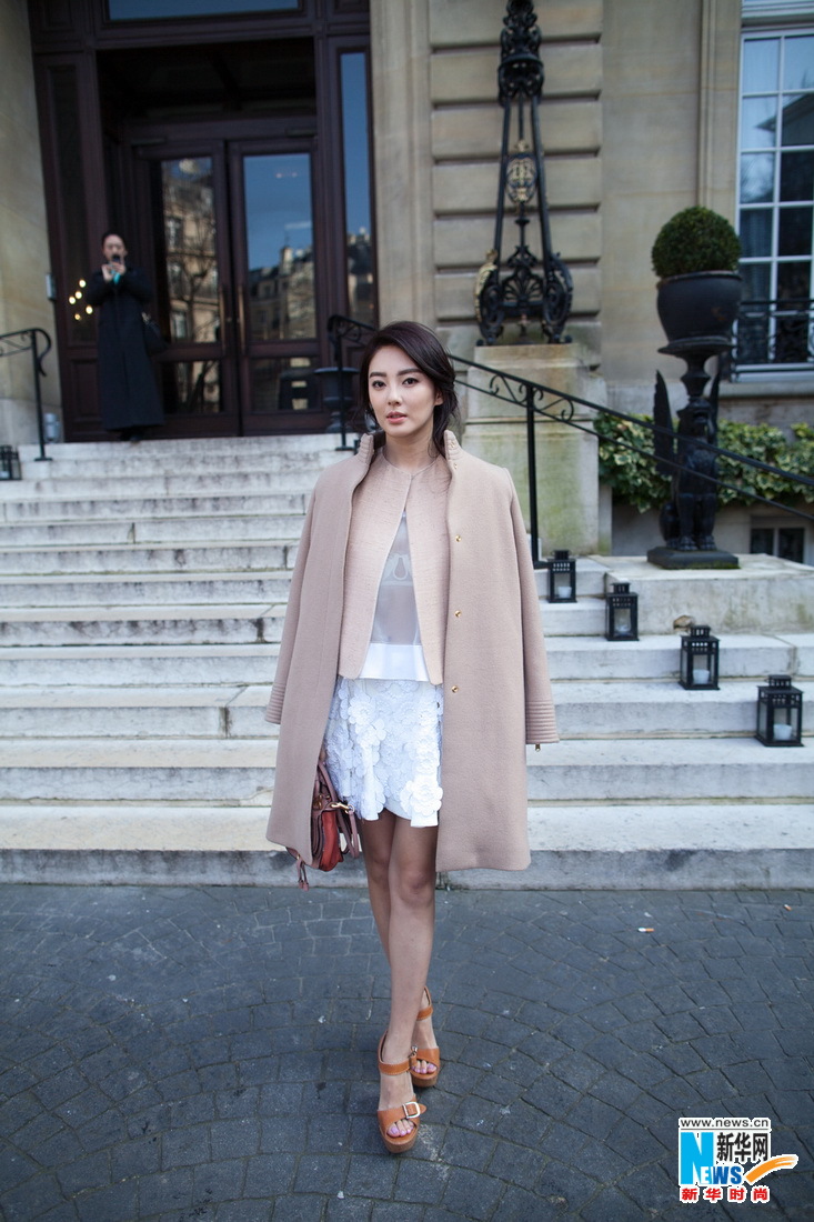 巴黎時間3月3日張雨綺現(xiàn)身巴黎時裝周Chloe 2013秋冬秀場。此次觀秀張雨綺身著裸色短款外套,搭配白色碎花短裙精致隨意。輕紗上的花卉圖案、輕柔飄逸的衣衫線條,張雨綺仿佛置身花園休憩的公主沐浴在巴黎浪漫氛圍中。簡潔干練的剪裁更凸顯其清新、淡雅、時尚的氣息。