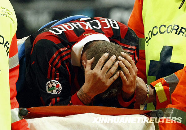 貝克漢姆痛苦的被擔(dān)架抬出賽場(chǎng)。新華社/路透