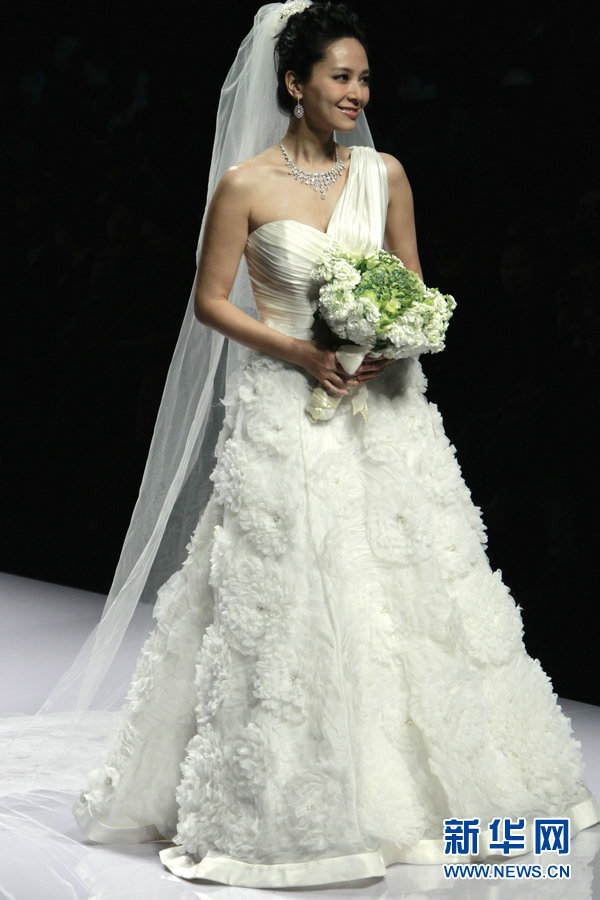 3月26日,香港藝人郭羨妮在展示香港設計師何國鉦設計的高級婚紗。 3月26日,在中國國際時裝周的舞臺上,香港設計師何國鉦以“部落皇后”為主題的時裝發布會將人們帶進了充滿異域風情的非洲世界。 新華社記者李明放 攝