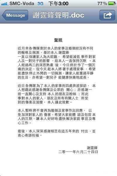 謝霆鋒發聲明欲盡快處理家事 2011-06-25 17:32