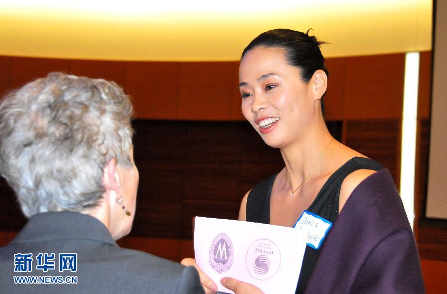 12月15日,中國冠軍班班長、皮劃艇世界杯冠軍鐘紅燕在畢業典禮上與外籍老師交談。當日,第二期中國冠軍班學員在美國威斯康星大學麥迪遜分校舉行畢業典禮,結束了近10個月的進修學習。 新華社發(蔣新彤攝)