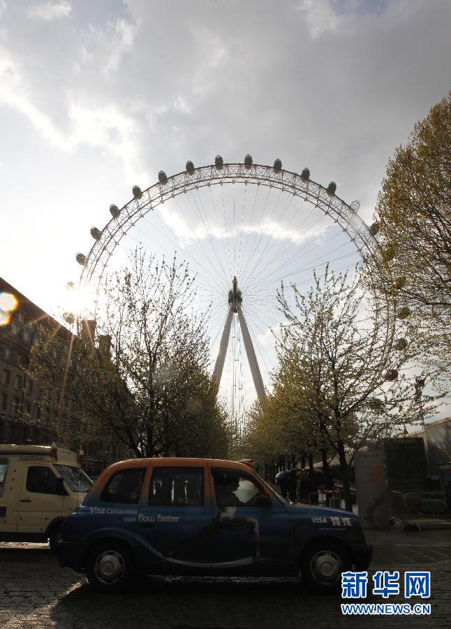 近日,倫敦街頭奧運(yùn)會(huì)官方贊助商廣告逐漸增多,為奧運(yùn)會(huì)的到來(lái)增添了氣氛。圖為一輛印有奧運(yùn)會(huì)官方贊助商VISA廣告的出租車行駛在倫敦眼前(4月13日攝)。新華社記者王麗莉攝