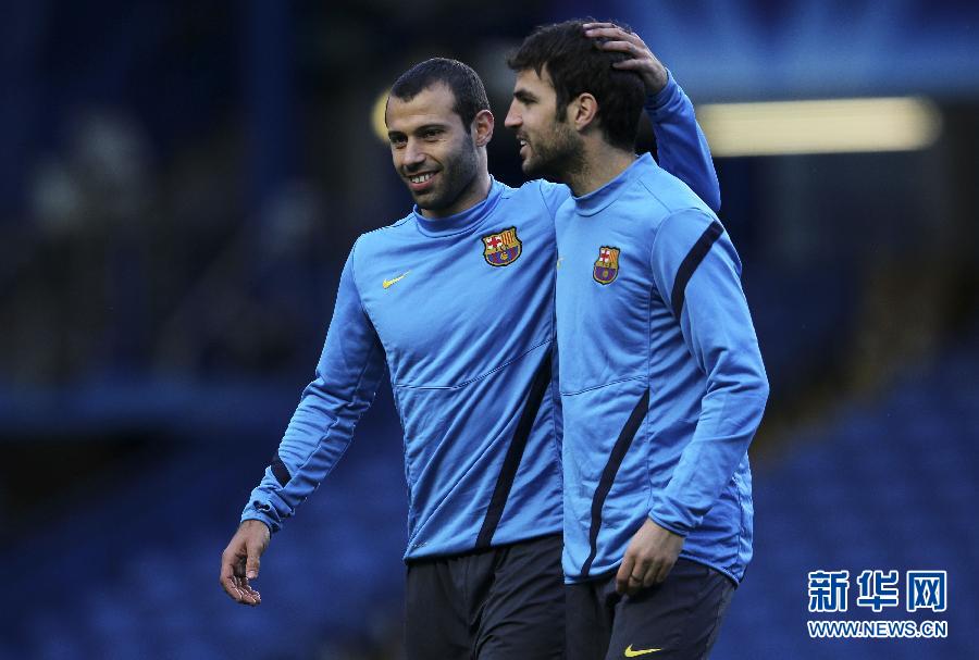 4月17日,巴塞羅那隊(duì)球員馬斯切拉諾(左)和隊(duì)友法布雷加斯在訓(xùn)練中。當(dāng)日,巴塞羅那隊(duì)在倫敦進(jìn)行訓(xùn)練,備戰(zhàn)18日與切爾西隊(duì)的歐冠聯(lián)賽半決賽首回合比賽。新華社/路透