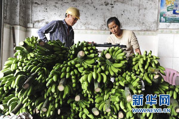 4月7日,海南瓊海市塔洋鎮一家收購站正在收購香蕉。國家統計局日前發布的“50個城市主要食品平均價格變動情況”顯示,3月下旬這些城市的主要食品價格相比3月上旬和中旬呈現反彈跡象,其中國產香蕉上漲4.2%,居價格上漲首位。目前海南春季香蕉已開始上市,受去年水災影響,瓊海香蕉產量和質量均有下降,收購價格達每公斤5元左右,是近年來少見的行情。新華社發(蒙鐘德 攝)