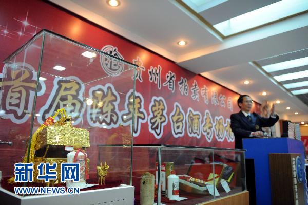 這是4月10日拍攝的陳年茅臺酒專場拍賣會現場。當日,由貴州省拍賣公司舉辦的“首屆陳年茅臺酒專場拍賣會”在貴陽開拍。102個標別的113瓶陳年茅臺酒參加拍賣,總成交價值達1223.3萬元。其中,一瓶被譽為“酒王”的“精裝漢帝茅臺酒”成交價高達890萬元,刷新了茅臺酒拍賣成交價格的歷史紀錄。新華社記者 歐東衢攝