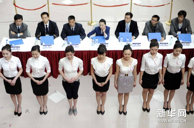 4月16日,選手上臺接受評委目測面試。當日,中國南方航空股份有限公司第六屆中國新空乘招募大匯南京選區“海選”拉開帷幕,吸引數千人參加。此次南航計劃在北京、廣州、武漢、長沙、鄭州、哈爾濱、西安、烏魯木齊、南京、重慶十大選區面向全社會公開招聘男女乘務員1500名。這將是我國民航史上最大規模的空乘人員招募。新華社發