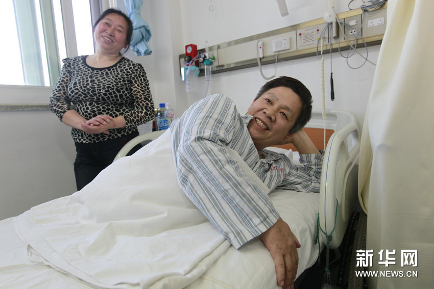 5月13日,“半截人”彭水林和妻子周愛群在北京宣武醫院的病房內休息。今年50歲的彭水林是湖南省湘鄉市的一名農民,2004年在深圳不幸遭遇車禍,骨盆以下肢體被完全粉碎。經搶救,彭水林身體被截去了一半,原本身高168厘米的老彭只剩下78厘米的上半身。雖然醫生將他從死亡線拉了回來,但傷口撕心裂肺的疼痛此后一直折磨著老彭。2011年4月,彭水林來到北京宣武醫院功能神經外科看病,于5月4日接受體內植入美敦力脊髓電刺激系統的“脊髓電刺激手術”治療。術后一周以來,困擾彭水林多年的疼痛消失了90%。新華社記者 任正來 攝