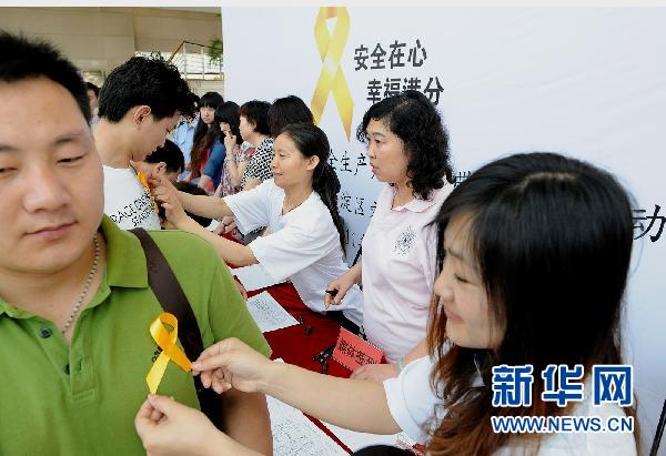 6月13日,北京市海淀區文化委員會工作人員為人們戴上寓意平安的黃絲帶。當日,北京市海淀區文化娛樂場所安全生產月“黃絲帶行動”啟動。該活動由北京市海淀區文化委員會主辦,為期一個月,包括一系列安全教育活動。新華社記者 張旭 攝