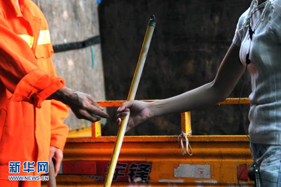 6月17日,在廣西柳州西環(huán)路口的一條巷子里,韋炳梅(右)接過(guò)父親手中的掃把幫忙掃街。韋炳梅的父親是一名環(huán)衛(wèi)工人,廣西柳州市西環(huán)路口旁的一條200多米長(zhǎng)的巷子是他的責(zé)任路段,兩旁開(kāi)著粉店、狗肉店、快餐店等,每天從清晨一直熱鬧到午夜,父親的任務(wù)就是保持這條巷子的整潔。每逢周末,夜半散場(chǎng),剩余食物等垃圾散落街道兩旁。在清理難度最大之時(shí),韋炳梅都會(huì)陪著父親出來(lái),在天亮前幫忙把巷子里所有的垃圾清理干凈。韋炳梅是柳州市內(nèi)一所專(zhuān)科院校的大一學(xué)生。因?yàn)樯钪赣H的辛苦,從小學(xué)六年級(jí)開(kāi)始,每逢周末等課余時(shí)間,她一有時(shí)間便都陪著做環(huán)衛(wèi)工人的父親上街掃地,如今她已堅(jiān)持了整整8個(gè)年頭。韋炳梅說(shuō),母親是殘疾人,父親做環(huán)衛(wèi)工人的收入是全家唯一的經(jīng)濟(jì)來(lái)源,但他從未放棄供姐弟倆讀書(shū)的想法。父親身體力行地教導(dǎo)韋炳梅自強(qiáng),不因貧困而自棄。新華社發(fā)(黎寒池 攝)
