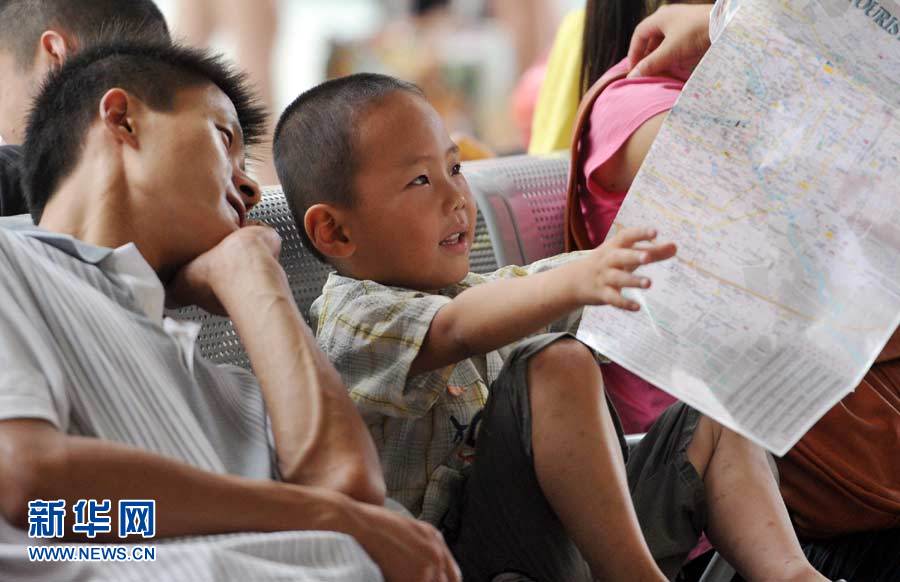 7月1日,在合肥火車站候車室,一名小旅客在翻看地圖。當(dāng)日,2011全國(guó)鐵路暑運(yùn)拉開帷幕。2011年鐵路暑期運(yùn)輸自7月1日起至8月31日止,共62天。全國(guó)鐵路將發(fā)送旅客3.65億人次,同比增長(zhǎng)12.7%,其中發(fā)送直通旅客1.28億人次,同比增長(zhǎng)9.3%左右。新華社記者 劉軍喜 攝