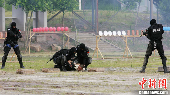 7月3日下午,重慶警局新招的57名反恐突擊隊員進行實戰培訓匯報演練。今年2月,重慶市面向全國以擂臺賽形式公開選拔反恐突擊隊員,從全國600精英人才中,遴選出57名反恐精英人才。經過3個月封閉式、多科目、高強度訓練,57名精英人才成為重慶“閃電”突擊隊隊員。重慶警局“閃電”突擊隊是于2009年10月成立的國家級反恐應急力量,隊員全由公安特警、武警和衛生等系統遴選出的精英組成,隊員均熟練掌握高空速降、直升機索降、單兵、小組突擊、水下突擊、遠距離狙擊等反恐戰術。