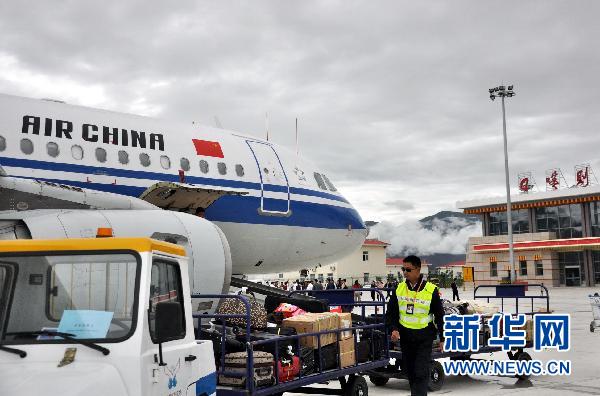 7月8日,西藏日喀則機場地勤人員為降落在機場的成都至日喀則首航班機卸載行李。當日,由中國國際航空執飛的四川成都至西藏日喀則航線首航。作為西藏自治區第二大城市,日喀則自此擁有了首條正式航線。 新華社記者 葛晨 攝