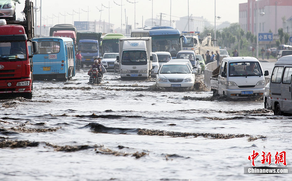 7月17日,哈爾濱市道里區(qū)機場路零公里附近,由于降雨造成嚴重積水,最深處達半米多,十多輛轎車和面包車在水中拋錨。據(jù)悉,積水造成雙向堵車長達四五公里,堵車近三個小時,積水漫上了人行道,給行人通行造成了許多麻煩。中新社發(fā) 靖陽 攝 圖片來源:CNSPHOTO
