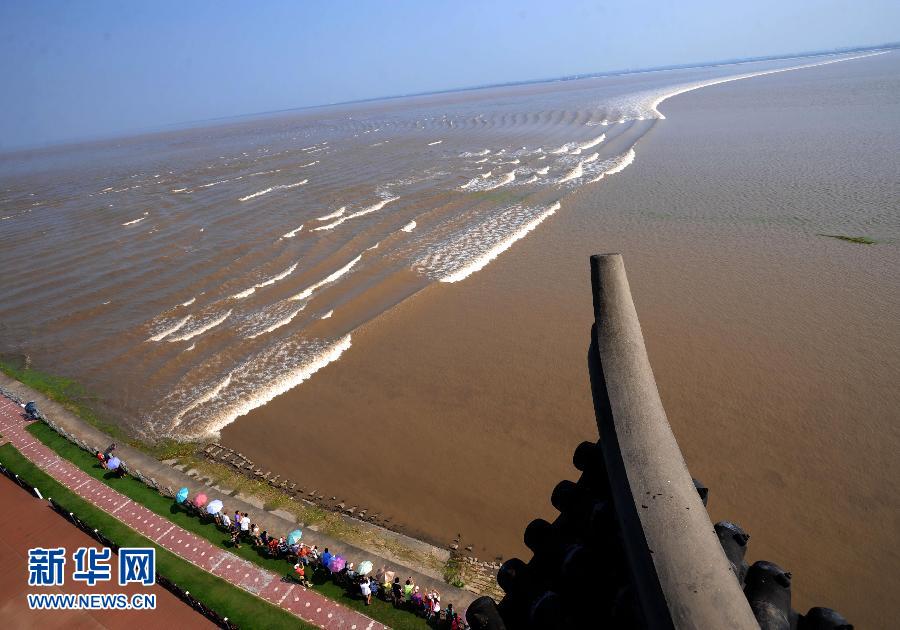 這是8月19日從浙江海寧市鹽官鎮占鰲塔上拍攝的錢塘江大潮。離農歷八月十八還有近一個月時間,目前已有眾多游客來到浙江海寧市鹽官鎮觀看錢塘江大潮。“八月十八潮,壯觀天下無”,每年農歷八月十八的錢江潮都以其磅礴的氣勢吸引數十萬游客前來觀賞。據當地政府部門介紹,經海事部門專家預測,今年海寧錢江潮有可能是近9年來最大的一次,今年的錢江大潮有起潮時間短、流差大、時間長等特點。一年一度的浙江海寧觀潮節將于9月10日開幕。新華社記者韓傳號攝