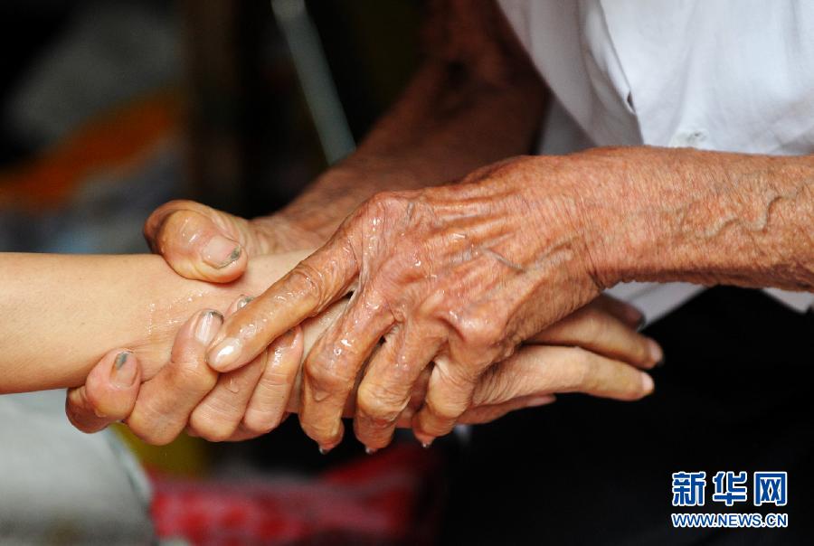 8月18日,許張氏給兒子洗手。 “除了感動還是感動!”“母愛無言!”“為老人祈福”……一張照片短短三天內在互聯網上掀起巨大反響,感動了無數網民。畫面上,在簡陋的屋子里,一位身材瘦小、白發蒼蒼、背駝得厲害的老人,正在艱難地給癱在床上、四肢肌肉都已萎縮的兒子喂粥。 這位老人為何在期頤高齡仍舊這般辛苦?她和兒子這幾十年來都是怎么過的?帶著這些疑問,新華社“中國網事”記者日前來到安徽省亳州市譙城區,找到照片中的老人許張氏和她的兒子許全意,探尋網上照片背后的故事。新華社記者 劉軍喜 攝