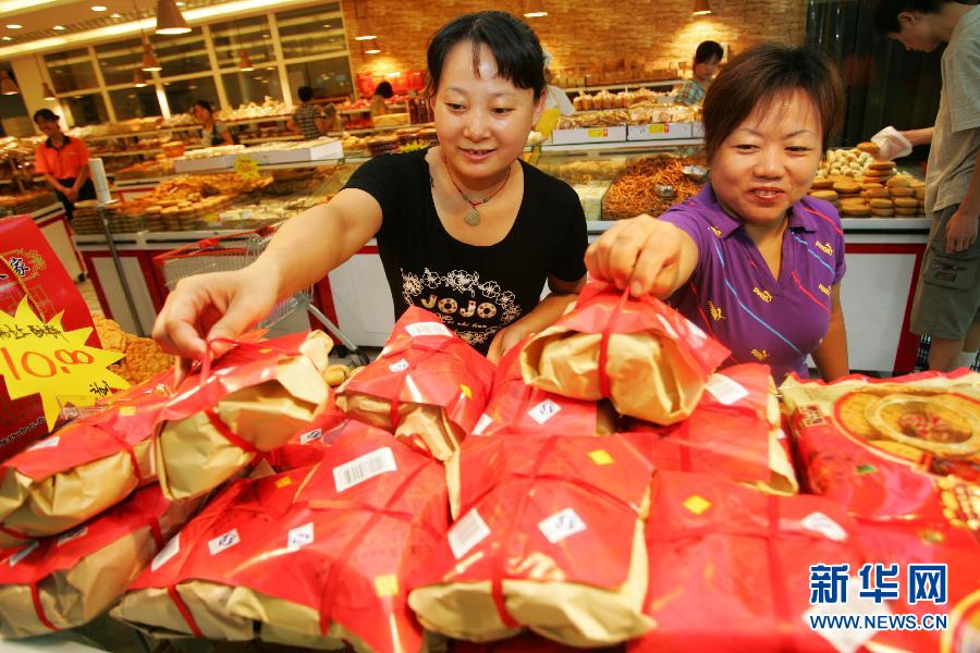 9月5日,消費者在山東濰坊一家超市選購簡裝月餅! ≈星锛压潓⒅,濰坊各商家紛紛推出各類簡裝月餅。瘦了“身”的月餅價廉物美,頗受消費者青睞。 新華社發(張馳 攝)