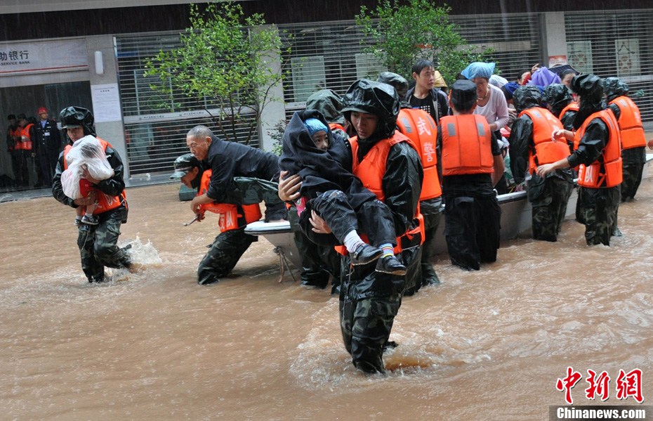 9月18日,四川巴中市境內普降暴雨,造成了巴河水位上漲約10米,超過警戒水位。巴州區曾口鎮洪水漫過街道,造成大量民眾被困,受災嚴重。截止18日晚間19時許,巴中市消防、民兵、武警等已出動警力上千人次,沖鋒舟50艘次,營救被困群眾600余人,疏散轉移民眾千余人。圖為救援人員正在轉移受困民眾和兒童。中新社發 曹雙友 攝