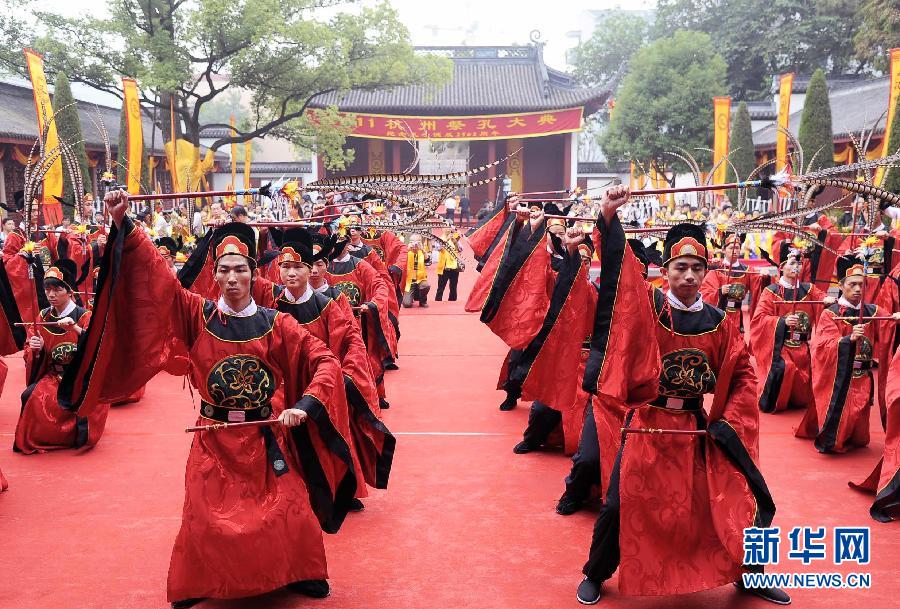 當日,“2011年杭州祭孔大典”在杭州舉行,杭州社會各界500多人參加了祭典活動,紀念孔子誕辰2562周年。 新華社發(施健學 攝)