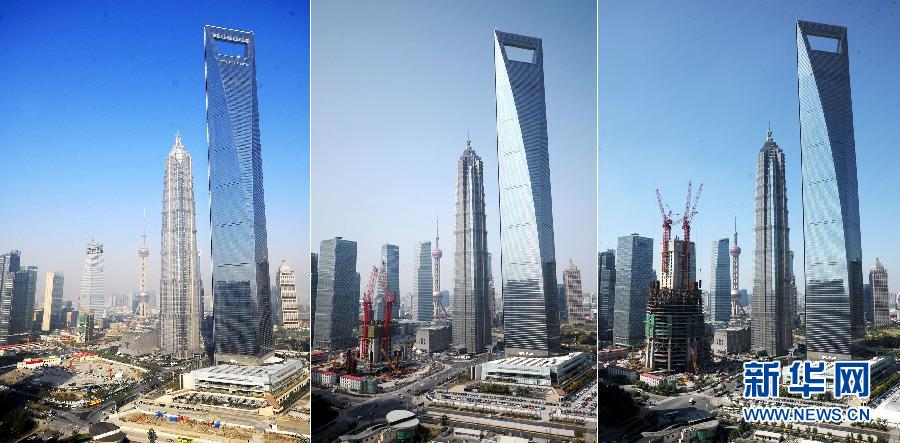 左圖:2008年11月29日拍攝的正式開工建設(shè)的上海中心大廈;中圖:2011年2月23日拍攝的建設(shè)到10層高度的上海中心大廈;右圖:2011年10月9日拍攝的開始35層以上施工的上海中心大廈(拼版照片)。近日,在建“中國(guó)第一高樓”上海中心大廈主樓核心筒開始35層以上高度建設(shè),主樓高度即將突破200米。10月10日,上海中心大廈將進(jìn)行地下爆破拆除施工,地下5層開始進(jìn)入最后施工階段。新華社發(fā)(鈕一新 攝)