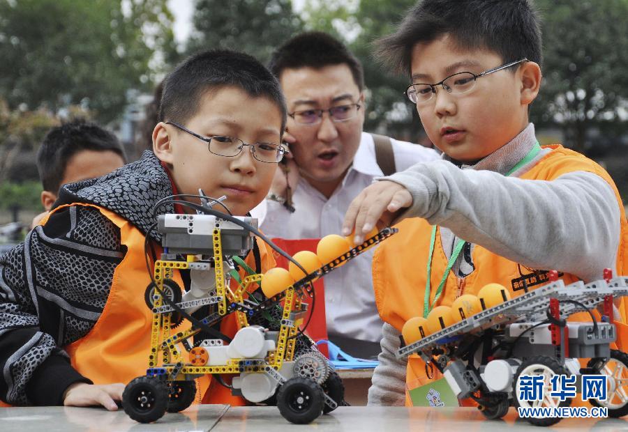 10月15日,在蘇州家庭機器人大賽賽場,兩名小選手對機器人進行賽前調(diào)試! ‘(dāng)日,以“親情互動·科文交融”為主題的2011第四屆蘇州家庭機器人大賽在蘇州拉開帷幕,400多個家庭的1200余名選手參加了機器人足球射門賽、機器人投籃挑戰(zhàn)賽、低碳環(huán)保小車挑戰(zhàn)賽等多個項目的角逐! ⌒氯A社發(fā)(朱桂根 攝)