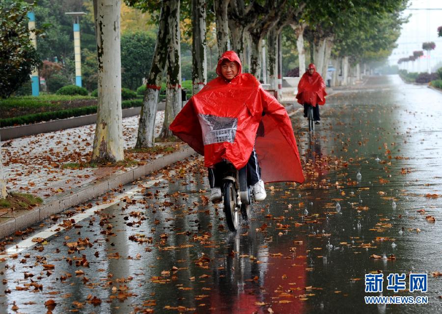 10月23日,山東省棗莊市山亭區(qū)市民冒雨騎行在落滿秋葉的道路上。 當(dāng)日,隨著冷空氣入侵,我國中東部部分地區(qū)迎來雨雪天氣,氣溫驟降。新華社發(fā)(李宗憲 攝)