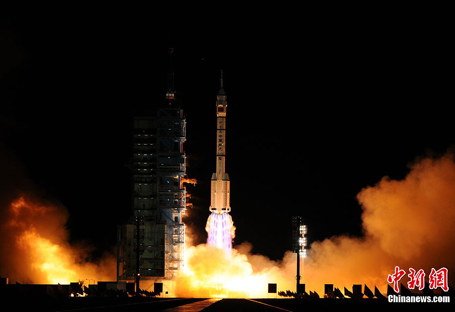 11月1日5時(shí)58分07秒,中國(guó)“長(zhǎng)征二號(hào)F”遙八運(yùn)載火箭在酒泉衛(wèi)星發(fā)射中心載人航天發(fā)射場(chǎng)點(diǎn)火起飛,將“神舟八號(hào)”飛船發(fā)射升空。孫自法 攝