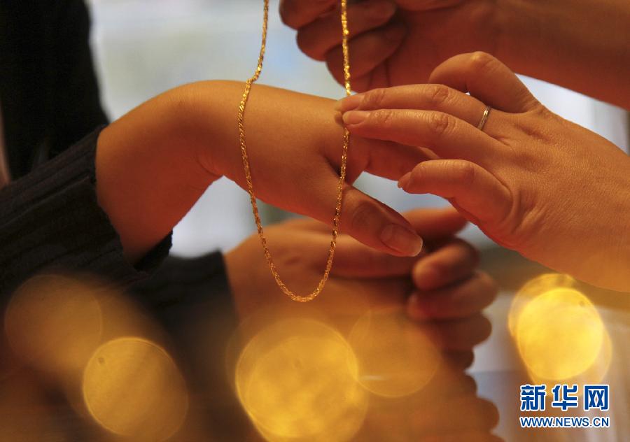消費者在山東省臨沂市郯城縣一家金店試戴金飾(2011年10月21日攝)。當日,中國黃金協會會長、中國黃金集團公司總經理孫兆學在天津舉行的“2011中國國際礦業大會”上預測,今年我國黃金產量將超過350噸,消費量則將達400噸。新華社發(張春雷 攝)