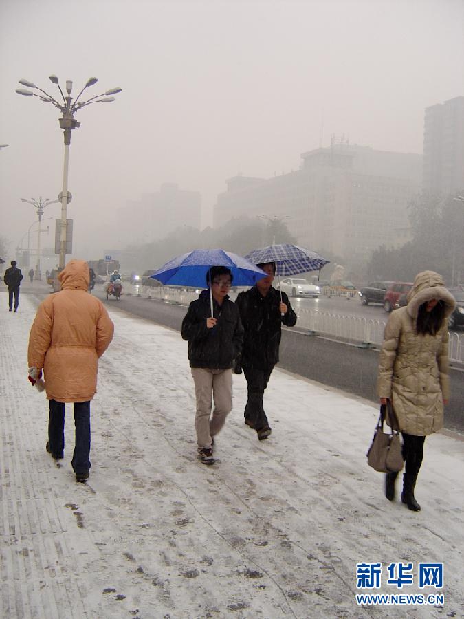 2011年12月2日,北京降下今冬第一場雪。圖為,人們走在北京一處積雪覆蓋的人行道上。當日,北京降下今冬第一場雪,目前降雪仍在持續。 新華社記者 徐子鑒 攝