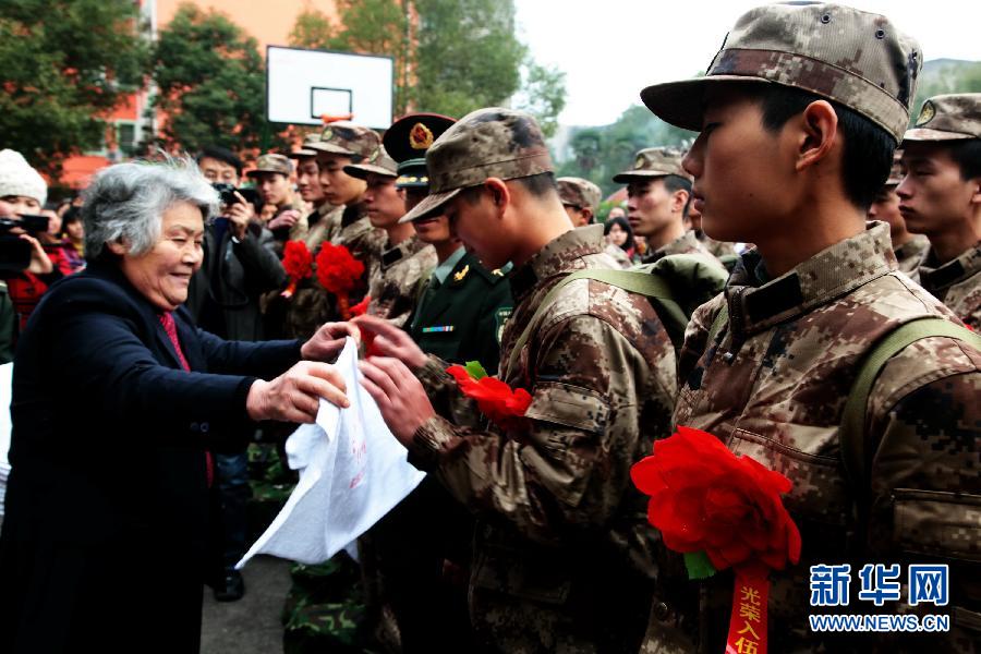 當(dāng)日,湖北省枝江市舉行新兵入伍歡送儀式,被稱為“擁軍奶奶”的全國愛國擁軍十大新聞人物、年屆七旬的退休干部毛成秀到場送別新兵。 新華社發(fā)(劉衛(wèi)東 攝)