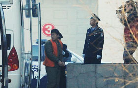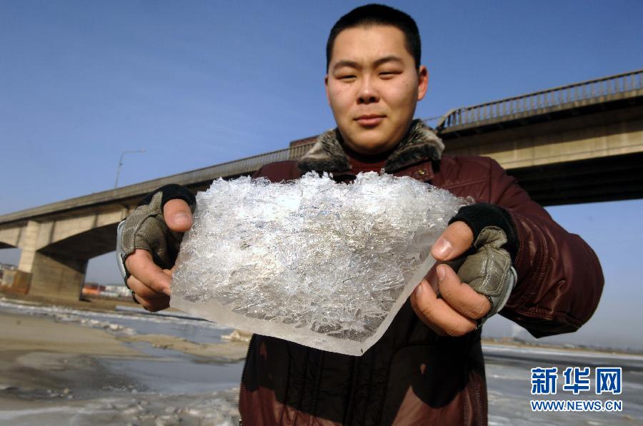 12月22日,在寧夏回族自治區石嘴山市黃河大橋下,一名群眾在向記者展示流凌冰塊的厚度。