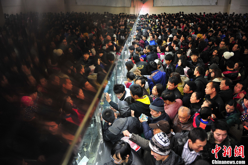 2011年12月28日,湖南省長沙市火車站售票大廳,前來買票的人們排起了長隊。當(dāng)天是廣鐵春運火車票預(yù)售第一天,受互聯(lián)網(wǎng)售票、電話訂票和學(xué)生放假等因素的影響,湖南省長沙火車站迎來購票高峰。中新社發(fā) 郭立亮 攝