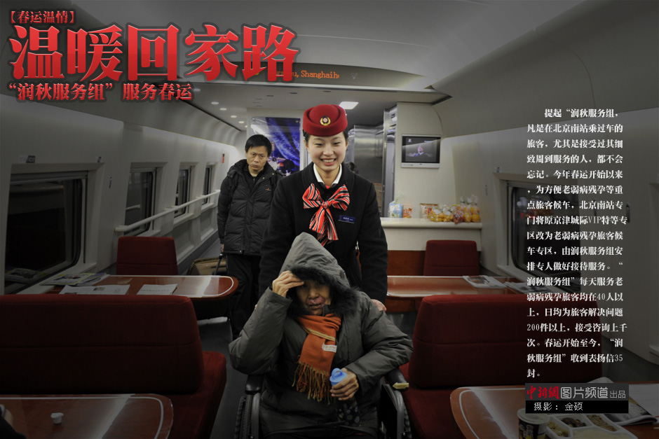 2012年1月11日,“潤秋服務組”為北京南站候車大廳老弱病殘孕旅客提供細致入微的貼心服務。中新網記者 金碩 攝 2012年1月11日,“潤秋服務組”為北京南站候車大廳老弱病殘孕旅客提供細致入微的貼心服務。