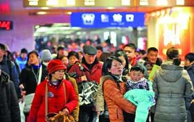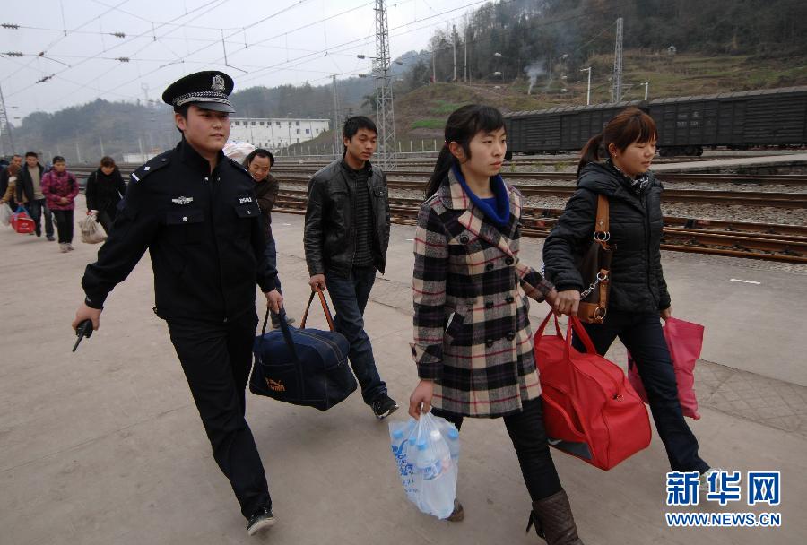 1月31日,鐵警在宣漢車站幫旅客提行李進(jìn)站乘車。當(dāng)日是正月初九,由四川宣漢始發(fā)的L136次農(nóng)民工專列載著2000余名乘客開往廣州,西安鐵路公安局安康公安處組織大量警力在始發(fā)站投入安全保衛(wèi)工作,并為外出務(wù)工人員宣講安全乘車、防盜防騙知識。新華社記者 李一博 攝