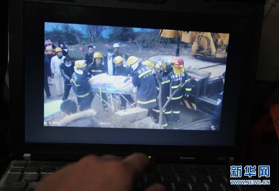 2月23日,一名記者在采訪時編發由消防部門提供的消防人員將中毒者抬出事故現場的視頻。