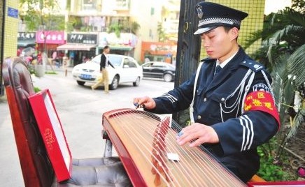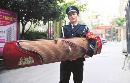 在小區門口彈古箏 保安哥十足文藝范兒
