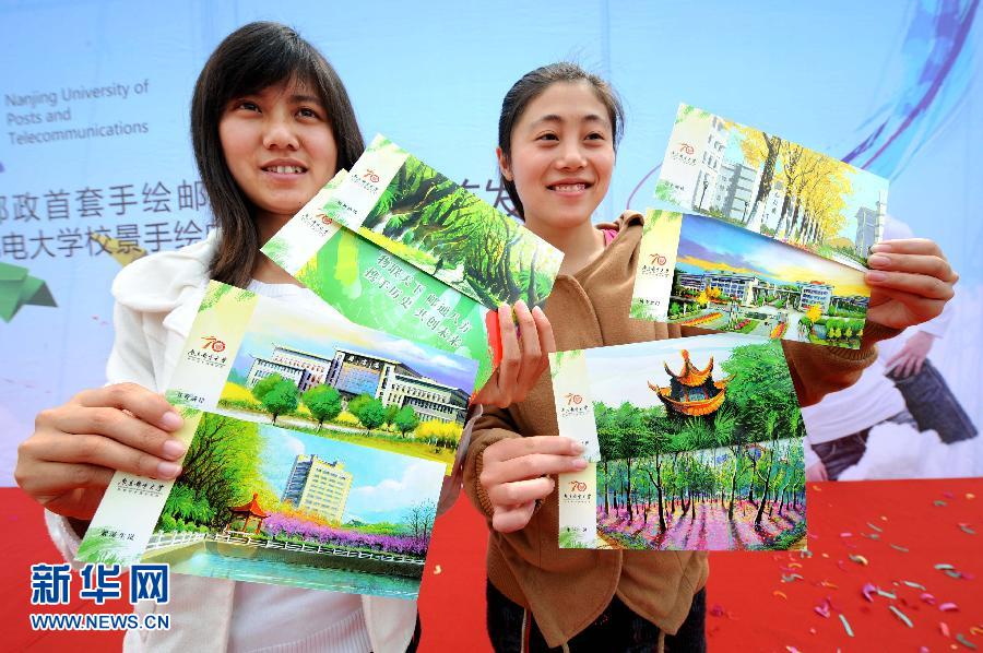 4月15日,兩名女生在首發式上展示手繪校景明信片。當日,江蘇郵政首套手繪型明信片——《南京郵電大學校景手繪郵資明信片冊》首發式在南京郵電大學舉行。這套校園風光主題手繪型明信片是為南京郵電大學70周年校慶而發行的。全套明信片共8枚(含校慶主題片1枚),以南京郵電大學校園中7處代表性景觀為設計元素,通過手繪藝術形式和風格加以表現,具有濃郁的校園文化特色。新華社記者 孫參 攝