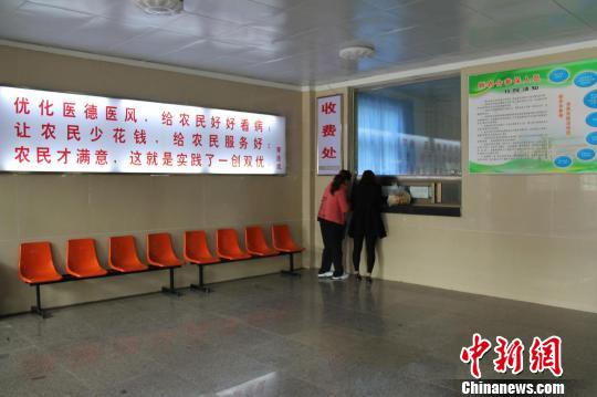 村里這所總投資達9000萬的民生醫院,目前已達到城市二級醫院的水準和規模。醫院內的墻上掛著李連成的話 湯荔 攝